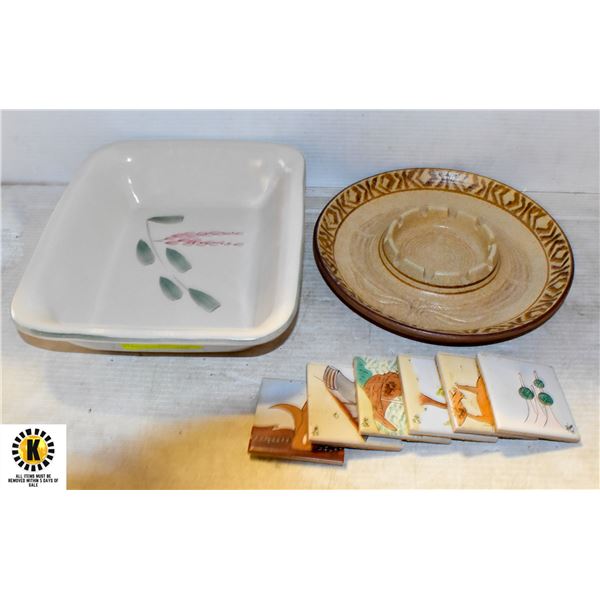 COYOTE POTTERY CASSEROLE, POTTERY CRAFT ASHTRAY,