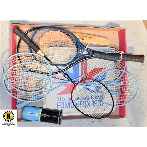 BADMINTON, TENNIS, SQUASH RAQUETS, BALLS, BOOMERAN