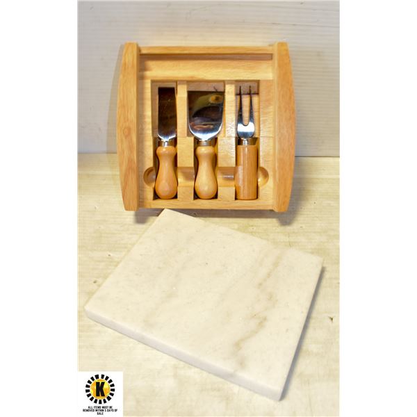 WOOD AND MARBLE CHEESE KNIFE AND BOARD SET