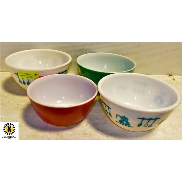 4 VINTAGE VARIOUS SIZE AND COLORS PYREX BOWLS