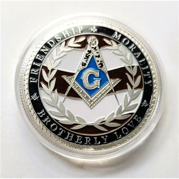AND WHITE ENAMEL FREEMASON FRIENDSHIP/MORALITY & BROTHERLY LOVE TOKEN.
