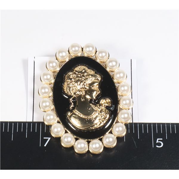 NEW FAUX PEARL CAMEO STYLE BROOCH BLACK