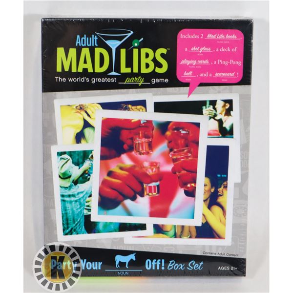 INCLUDES 2 MAD LIBS BOOKS, A SHOT GLASS, DECK OF PLAYING CARDS, A PING PONG BALL AND SCORE CARD.