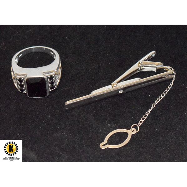 11.5G 925 STERLING SILVER MENS RING WITH LARGE ONYX STONE. TIE CLIP WITH SMALL CZ