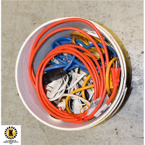 PAIL OF 13 EXTENSION CORDS, 3 OUTDOOR, 10 INDOOR VARIOUS LENGTHS