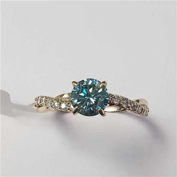 10K YELLOW GOLD GREENISH BLUE MOISSANITE(0.85CT) WHITE MOISSANITE(0.15CT) RING SIZE 7 WEIGHT 1.89G, MADE IN CANADA, APPRAISED RETAIL $2000**ALL ITEM