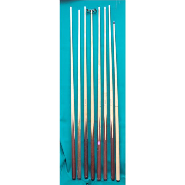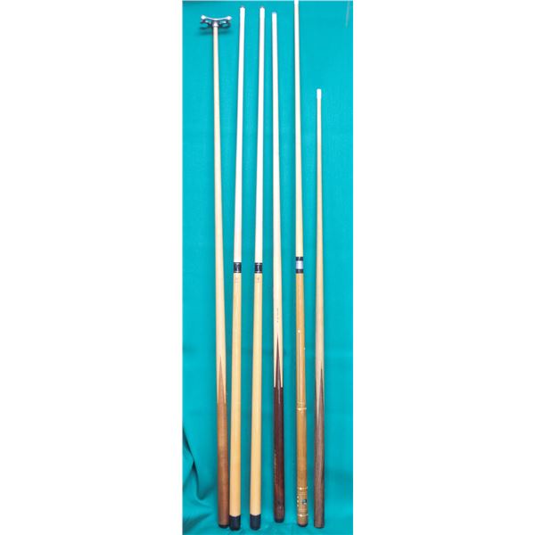 BUNDLE OF 6 USED ASSORTED POOL CUES; LUCKY BRAND & MISC. VARIOUS WEIGHTS * AS IS*