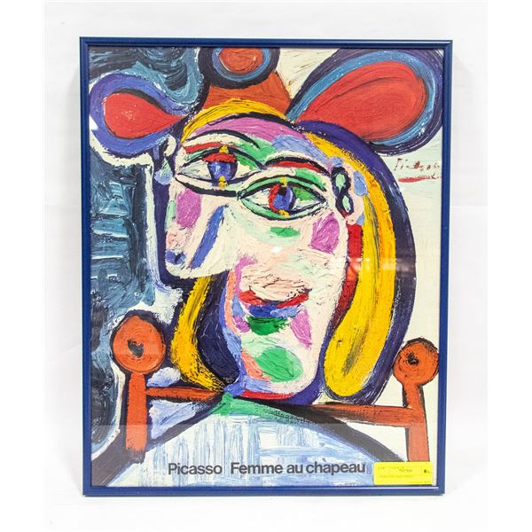 FRAMED PABLO PICASSO PRINT TITLED “FEMME AU CHAPEAU.” MEASURES APPROX. 16 X 20 INCHES WITH FRAME. **ALL ITEMS MUST BE REMOVED BY