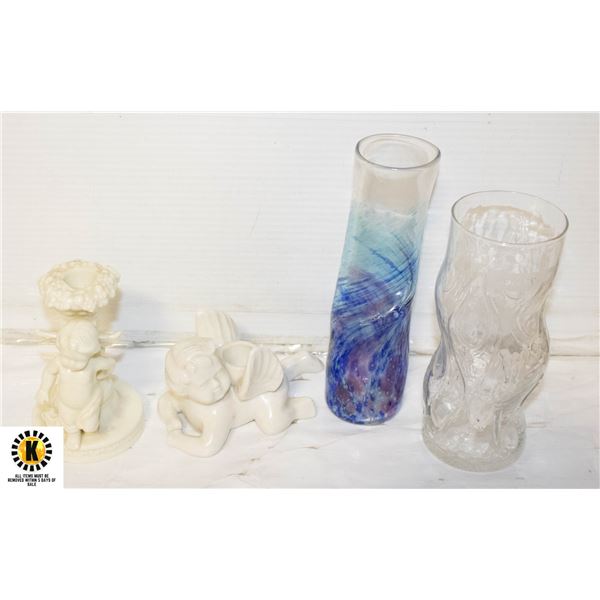 VINTAGE WHITE CERAMIC CHERUB ANGEL HANDLE HOLDER 5.5" TALL, LAYING CHERUB CANDLE HOLDER, ART COLOURED GLASS VASE , HOMEFIRE VASE