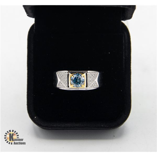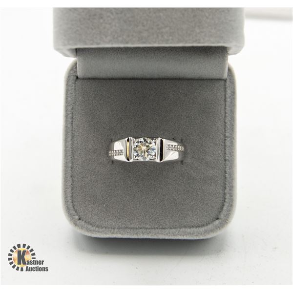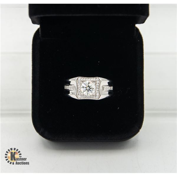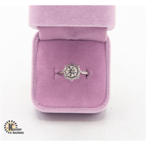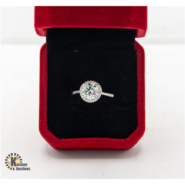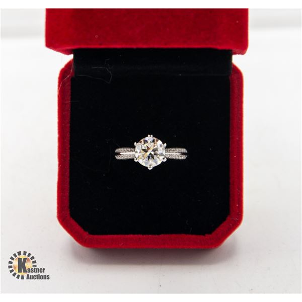 WITH 18 PRONG SET ROUND MOISSANITE SET IN STERLING SILVER RING SIZE 7 **ALL ITEMS MUST BE REMOVED BY 5PM SATURDAY, MARCH 2ND 2024. ALL REMAINING I