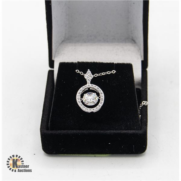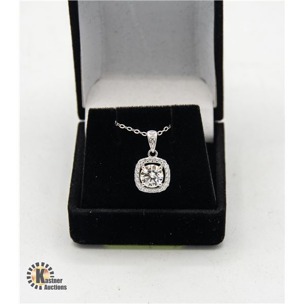 WITH HALO SURROUNDING PINK MOISSANITE WITH 36 ROUND CUBIC ZIRCONIUM WEIGHING AN APPROX. TOTAL 0.30 SET IN STERLING SILVER PENDANT AND NECKLACE **A