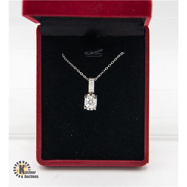 COLOR FULL CUT ROUND BRILLIANT MOISSANITE SET IN 6 PRONG SETTING IN NECKLACE SURROUNDED IN HALO OF 37 CUBIC ZIRCONIUM WEIGHING AN APPROX. TOTAL OF 0.3