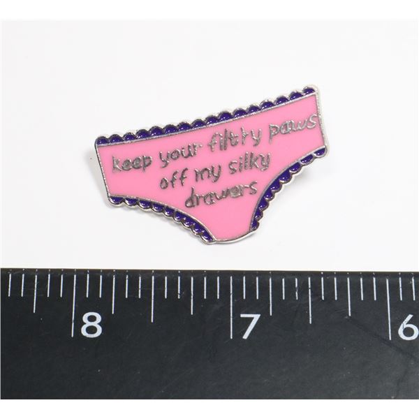 NEW PANTY LAPEL PIN. PINK LADIES THEME. MISPRINT.