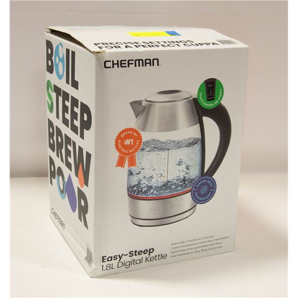 THE CHEFMAN EASY-STEEP 1.8L DIGITAL KETTLE HEATS WATER FAST FOR HOT BEVERAGES, SOUP, RAMEN, OATMEAL AND MORE! THE TEMPERATURE CONTROL WITH 7 PRESETS,