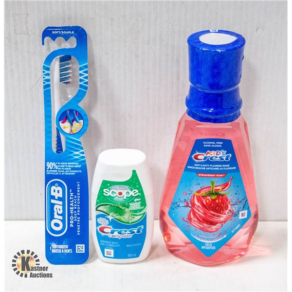 BRISTLE TOOTHBRUSH, KIDS CREST STRAWBERRY RUSH MOUTHWASH, CREST COMPLETE SCOPE TOOTHPASTE. AMZ SES
