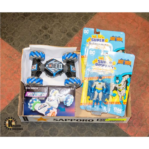 TWO MCFARLANE TOYS BAT MAN, TECNOCK TWIST STUNT CAR. ALL PRODUCTS ARE NEW, PACKAGING IS DAMAGED. AMZ SES