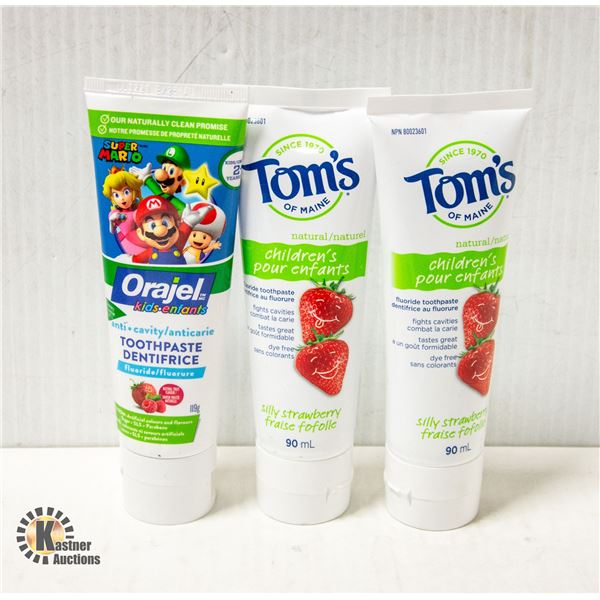 3 NEW TUBES OF CHILDRENS TOOTHPASTE - VARIOUS
