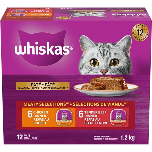 NEW 12 PACK OF WHISKAS WET CAT FOOD, MEATY