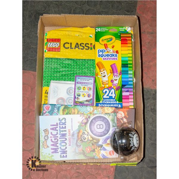 FLAT OF NEW KIDS TOYS INCLUDES CRAYOLA, LEGO MAT,