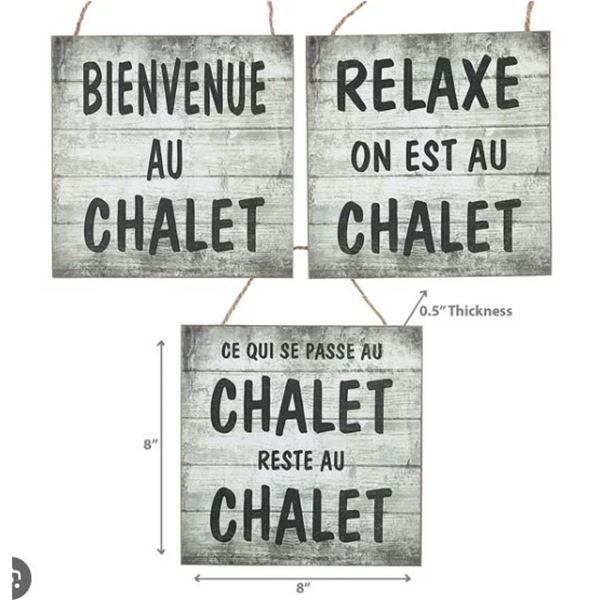 CHALET RESTE AU CHALET", "BIENVENUE AU CHALET" & "RELAXE ON EST AU CHALET"