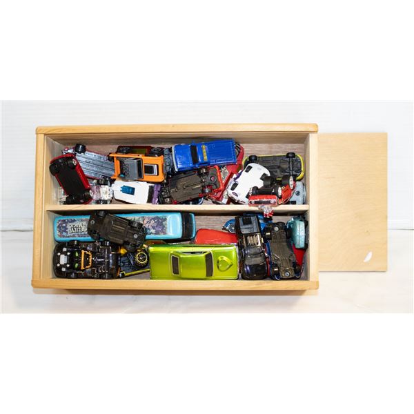 WOODEN CASE W/ASSORTED HOTWHEELS/CARS