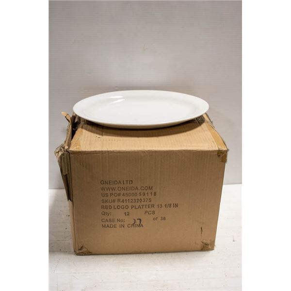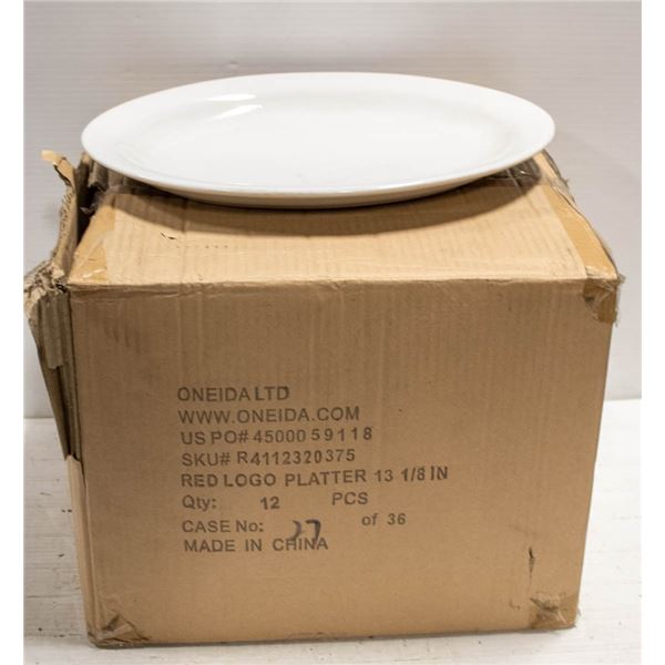 NEW 12PC 13 1/8" RED LOGO PLATTERS; WHITE
