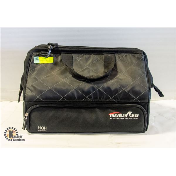 FOOD CARRIER INCLUDES SHOULDER STRAP, INSULATED TO KEEP WARM OR COLD, BLACK AND WHITE, WIPEABLE