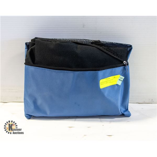 BLUE AND BLACK EQUIPMENT BAG, LARGE SIZED IN ZIPPERED COMPACT CARRYING CASE WITH HANDLE