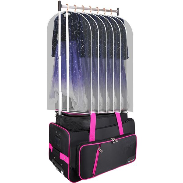 ROLLING GARMENT BAG, BLACK/PINK, 23" PLUS, POP UP RACK, DOESN'T INCLUDE GARMENT BAGS, WHEELED, DUFFEL, AMZ SES **ALL ITEMS MUST BE REMO...