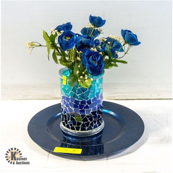 BLUE THEME PLATE/VASE AND ROSE DISPLAY PIECE