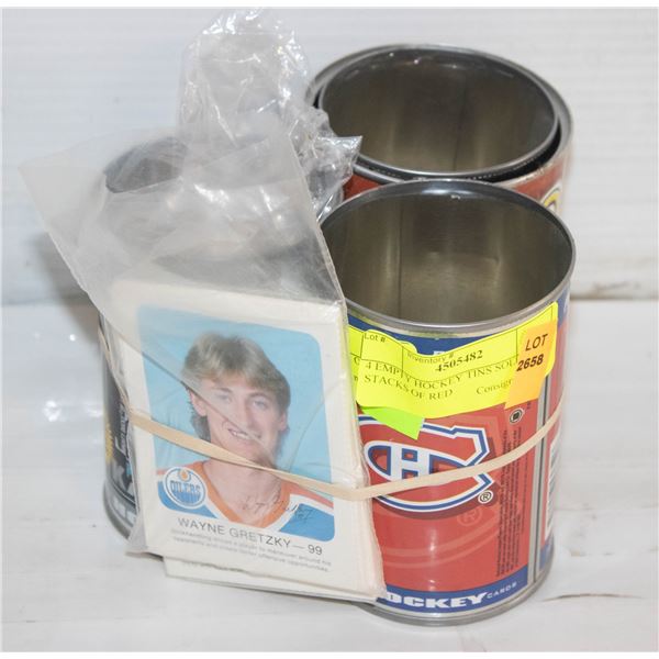 4 EMPTY HOCKEY TINS SOLD WITH 2 STACKS OF RED