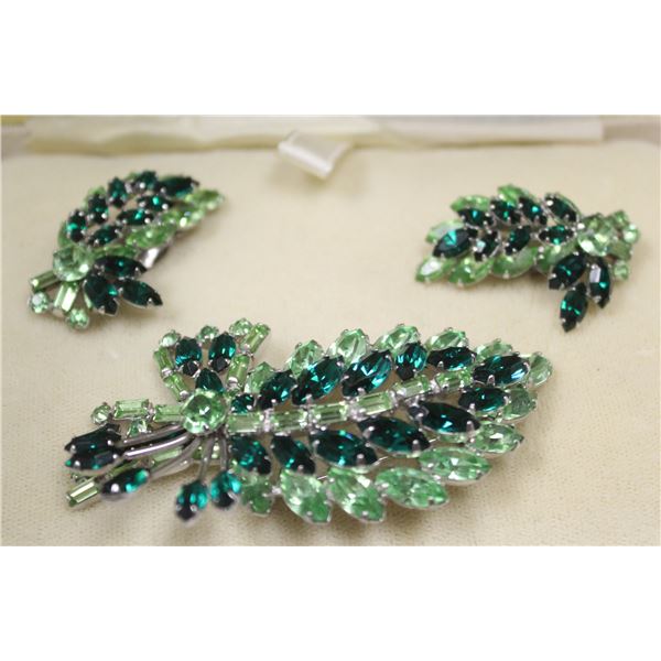 ANTIQUE SHERMAN GREEN BROOCH AND EARRINGS W BOX
