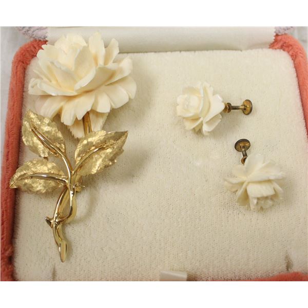 ANTIQUE CARVED ROSE BROOCH AND EARRINGS SET