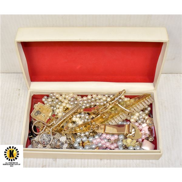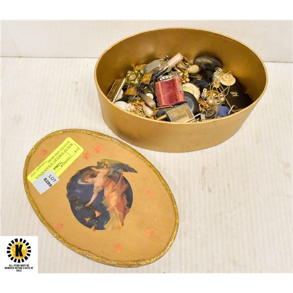 BOX OF JEWELRY SCRAPS KNICK KNACKS AND MORE