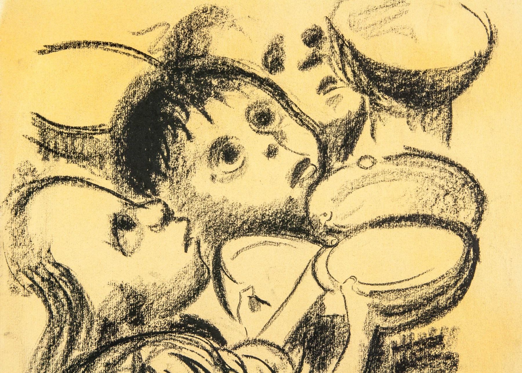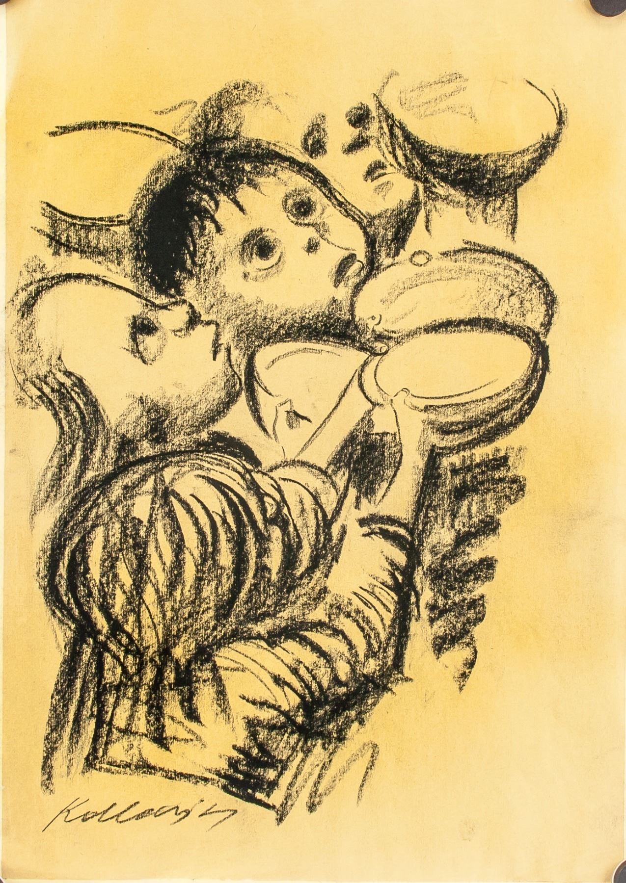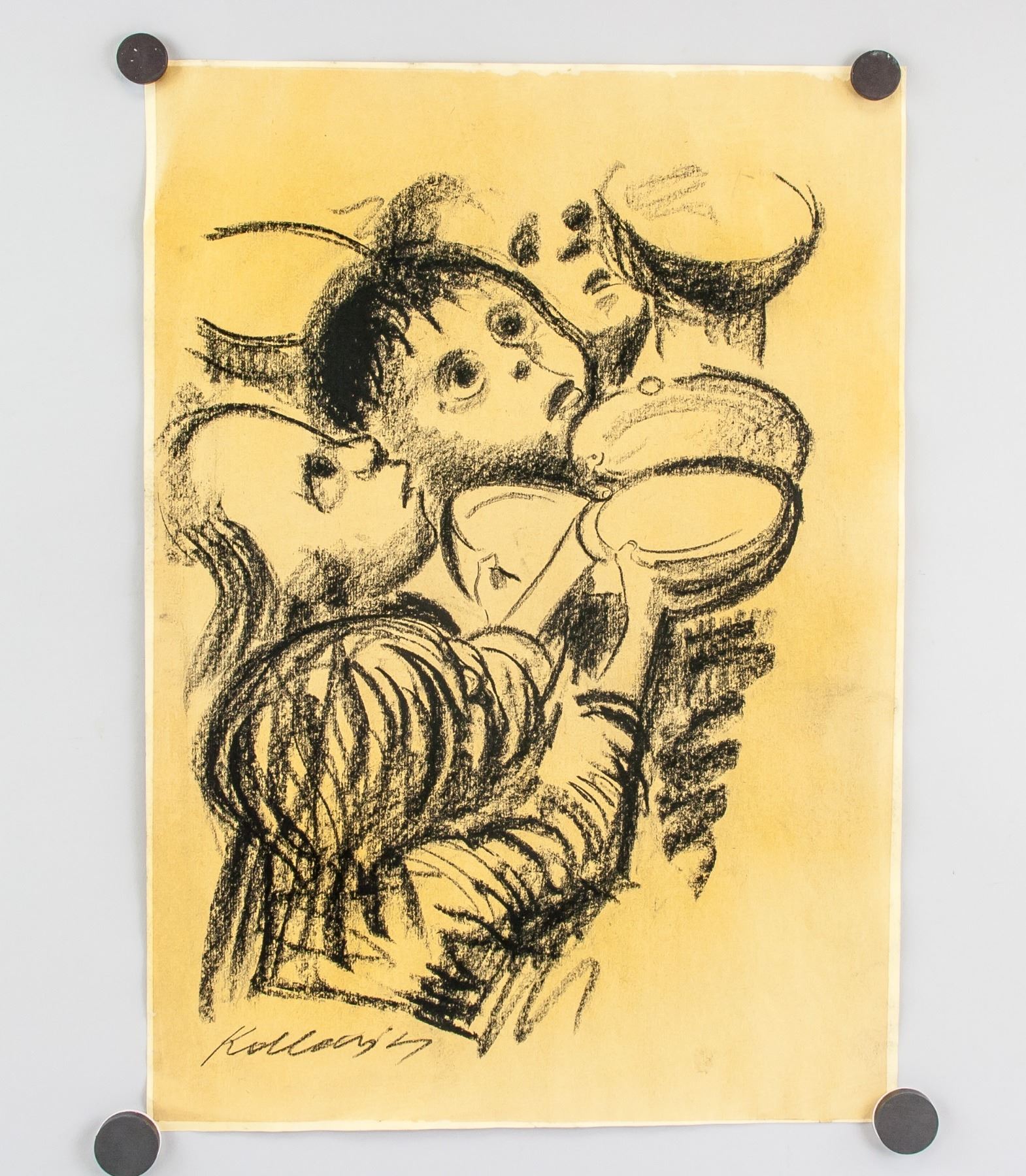 Charcoal on paper, featuring drawing of children. Signed and attr. Käthe Kollwitz (German, 1867-1945), signature on lower left margin. Stamped on verso. 15.7 x 11.8 in. (42 x 30 cm). Käthe Kollwitz was a German artist, who worked with painting, printmaking (including etching, lithography and woodcuts) and sculpture. Her most famous art cycles, including The Weavers and The Peasant War, depict the effects of poverty, hunger, and war on the working class. Despite the realism of her early works, her art is now more closely associated with Expressionism. Kollwitz was the first woman elected to the Prussian Academy of Arts. PROVENANCE: Private estate (Perugia, Italy)