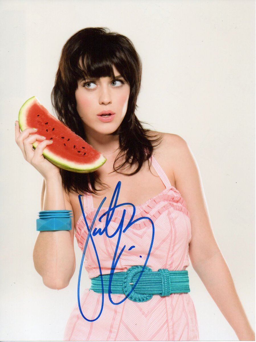 Katy Perry signed photo. 10x8 inches. Perry rose to fame in 2008 with the release of the singles "I Kissed a Girl" – which sparked controversy for its homosexual themes – and "Hot n Cold" from her second album, a pop rock record titled One of the Boys. Her third album, Teenage Dream (2010), ventured into disco, and contained the U.S. Billboard Hot 100 chart-topping singles "California Gurls", "Teenage Dream", "Firework", "E.T.", and "Last Friday Night (T.G.I.F.)" as well as the number-three single "The One That Got Away". The album became the first by a female artist to produce five number-one Billboard Hot 100 songs, and the second overall after Michael Jackson's album Bad. In March 2012, she re-issued the album as Teenage Dream: The Complete Confection, which produced the songs "Part of Me" and "Wide Awake".