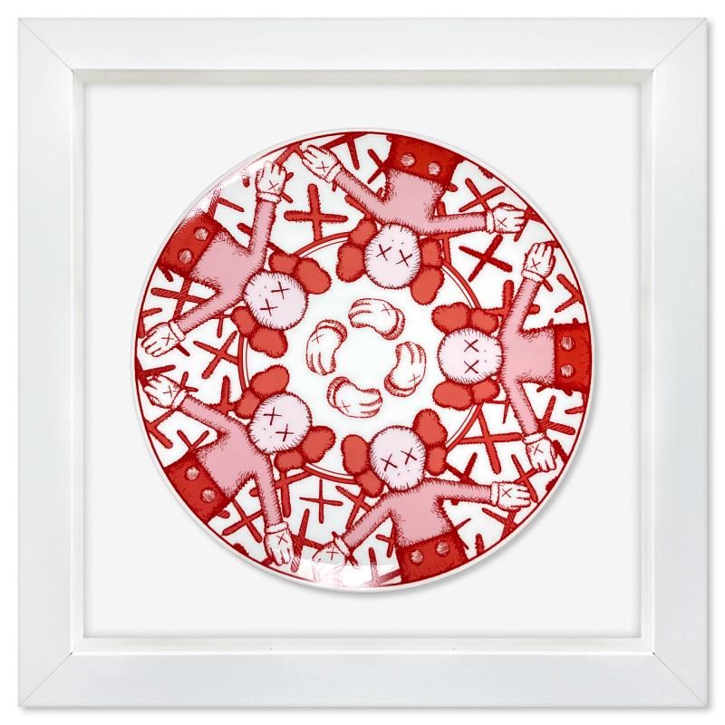 This is a porcelain plate by KAWS stamped inverso by the artists estate. This plate is custom framed and floated on linen. Measures approx. 14.5" x 14.5" (frame) 9" (plate diameter).
