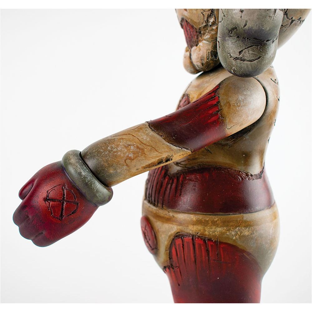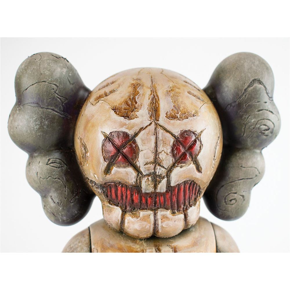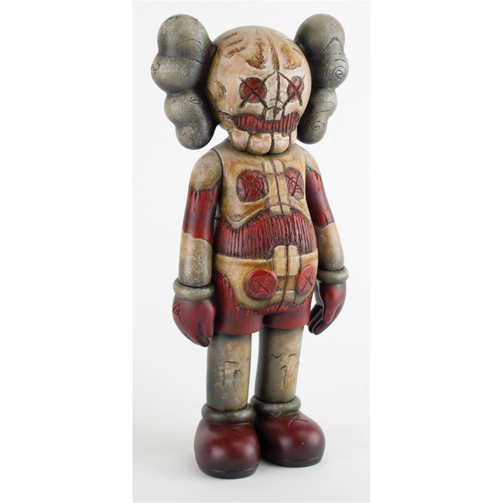 One-of-a-kind hand-painted reproduction KAWS 'Companion' doll by valleyDweller, entitled 'Fetish,' signed and dated on the bottom of one foot in yellow paint by the artist. Executed on the reproduction 16Ë KAWS Companion platform, the custom doll is rendered in tones of red, gray, and brown, with bony carvings on the face and body. Released through Strangecat Toys in their 'Misappropriated Icon 4' show of March 2021. In fine condition.