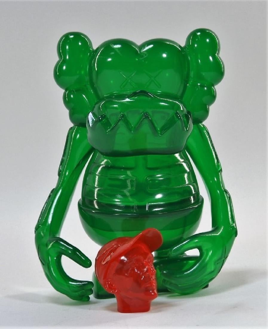 KAWS X Bounty Hunter, Skull-Kun (Clear Green) with red KAWS head, 2006, edition of 400. Cast vinyl. 6-1/2 x 4-1/2 x 3 inches. Stamped on the underside of feet.