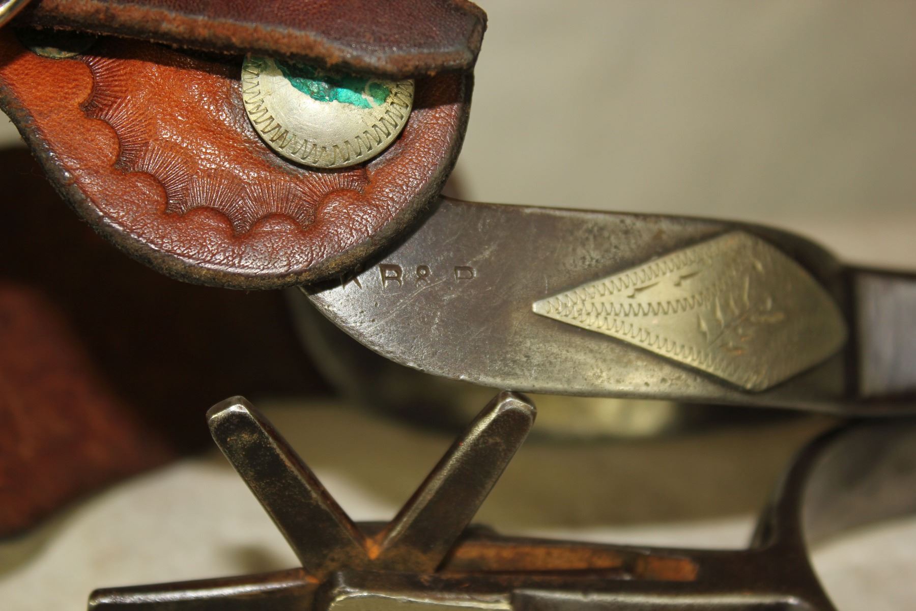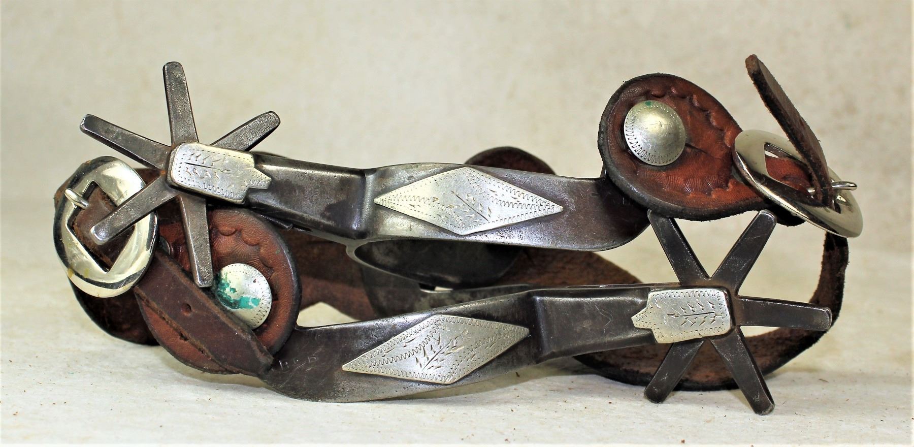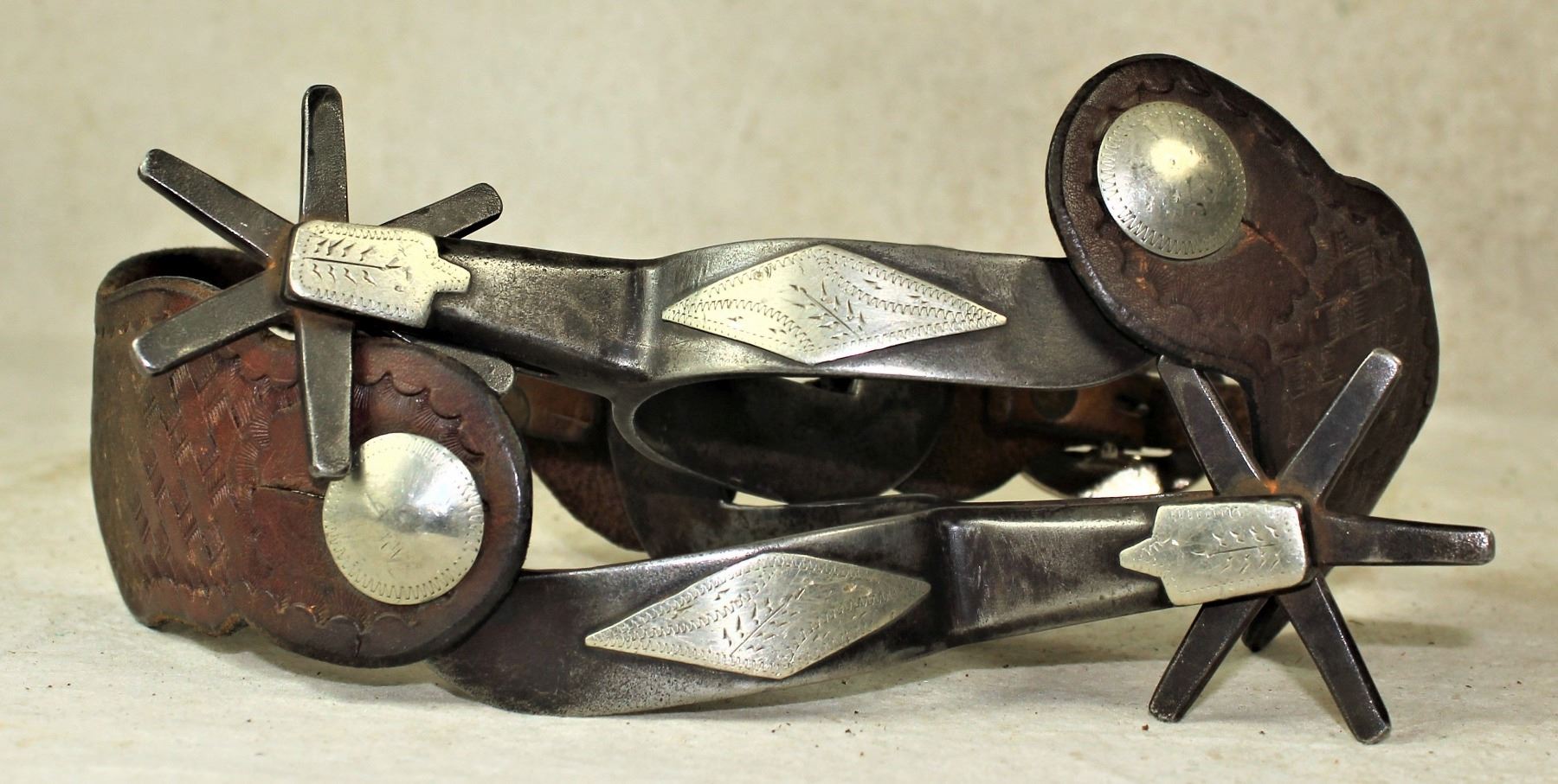 A seldom seen double mounted pair of diamond pattern spurs with huge 5 point rowels, and having their original straps.