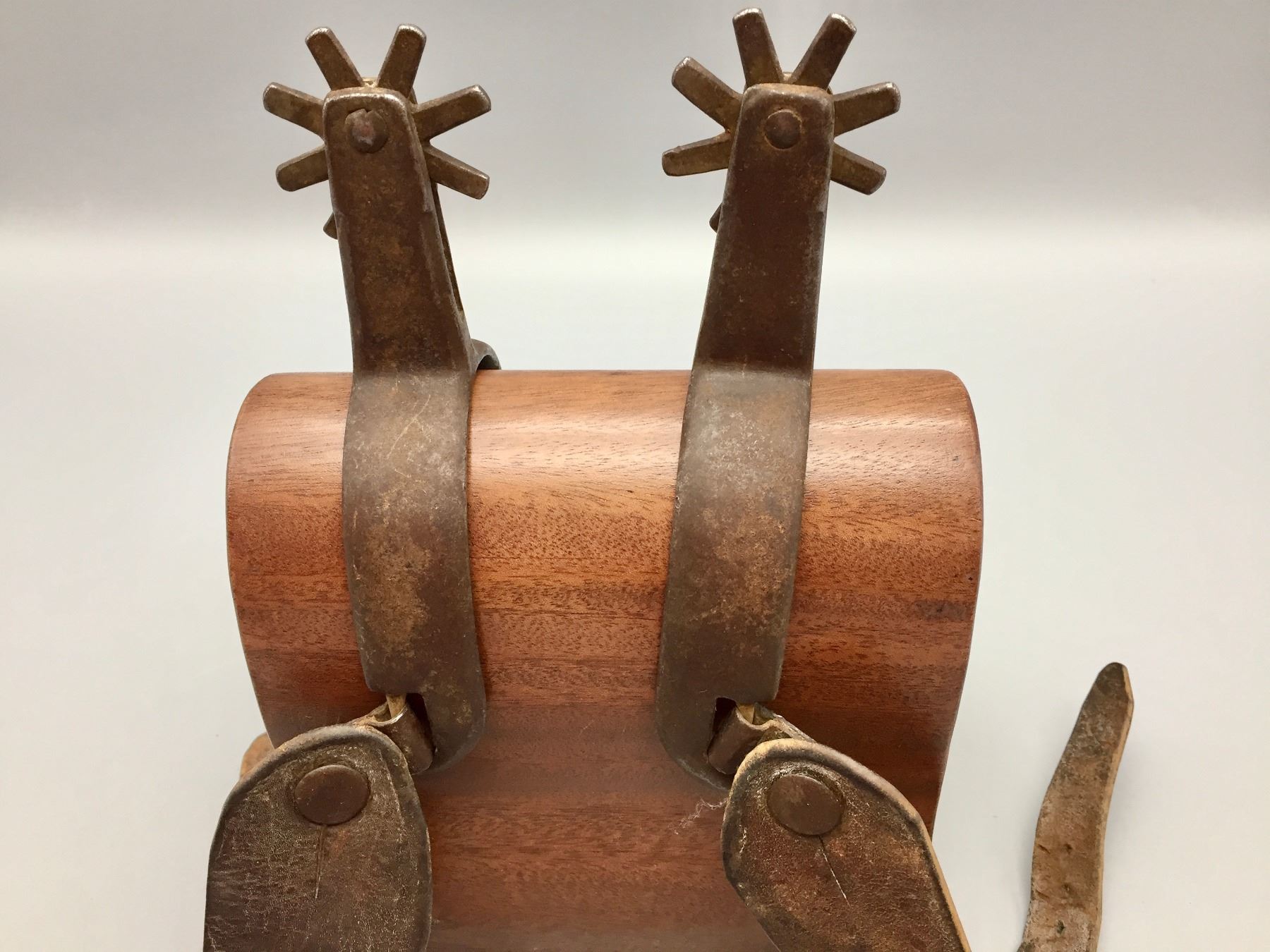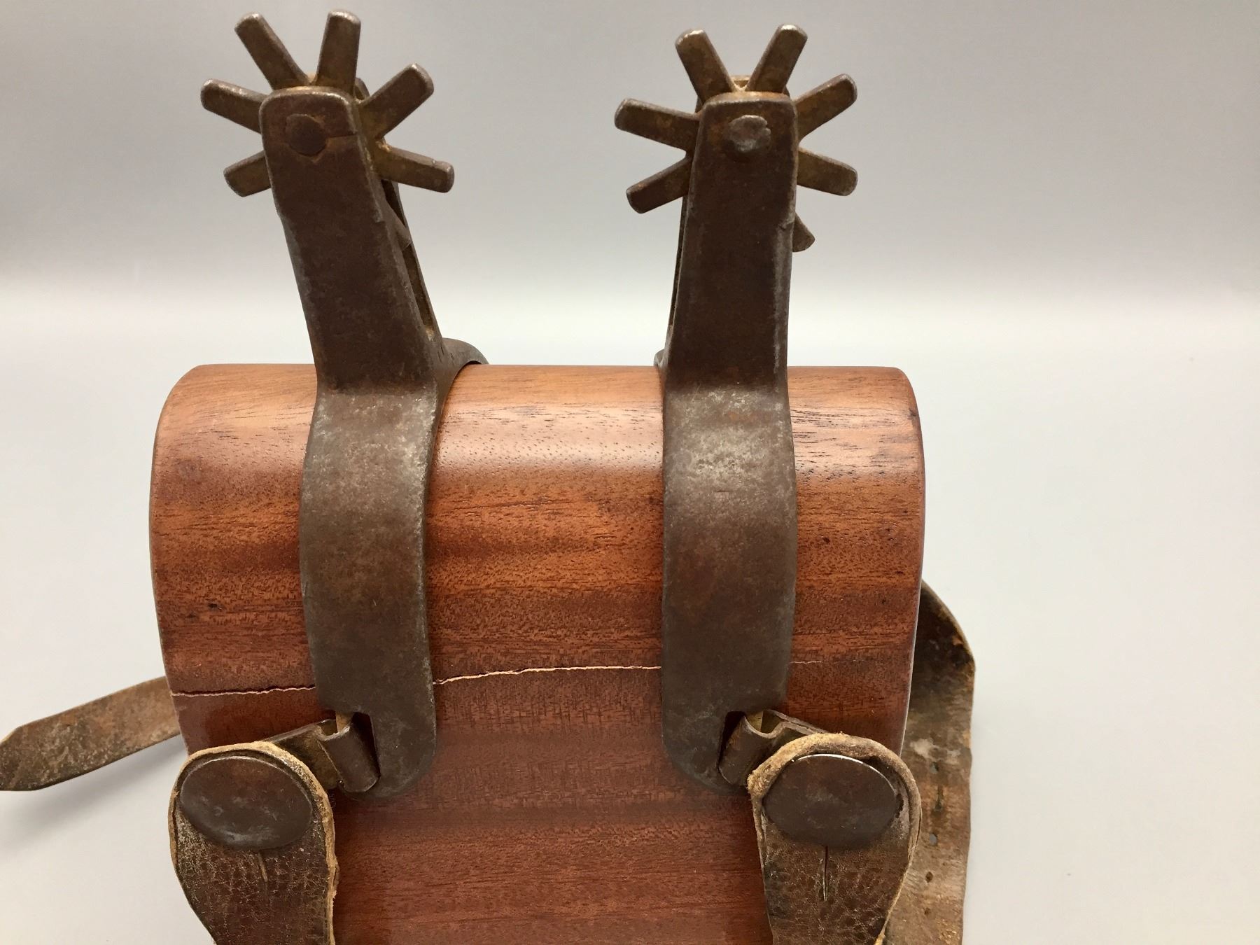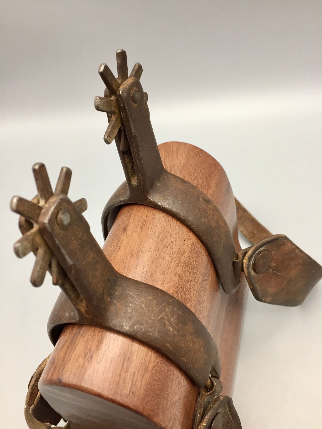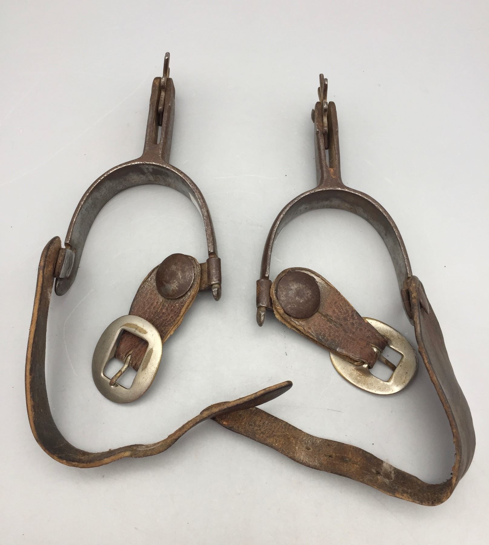 Description: Offered for sale in this lot is a pair of Kelly Bros. and Parker spurs with old, brown leather straps. Maker: KB and P (Kelly Bros and Parker). Approx. Age: Circa 1910 - 20. Size: 2-3/4” heel, 3” shank, 1” band. Condition: Good for their age, wear expected. Please look closely at the pictures - they are an important part of our description. Shipping: There will be a $5 handling / packaging fee for shipping this lot. The actual cost of postage will be added on top of that.