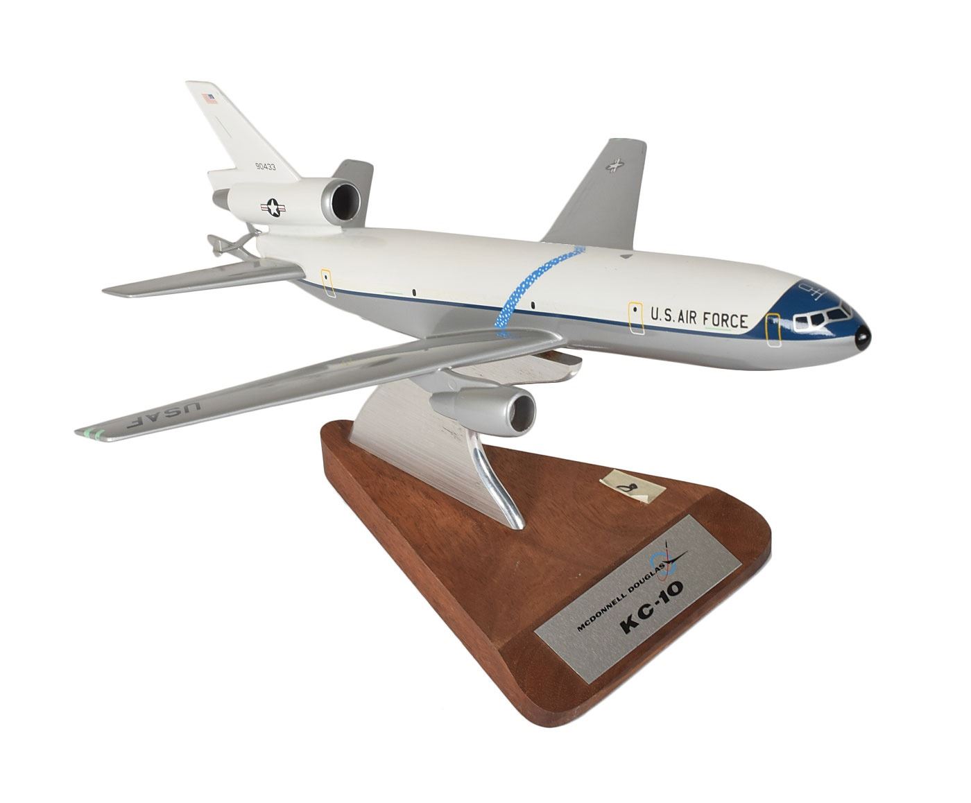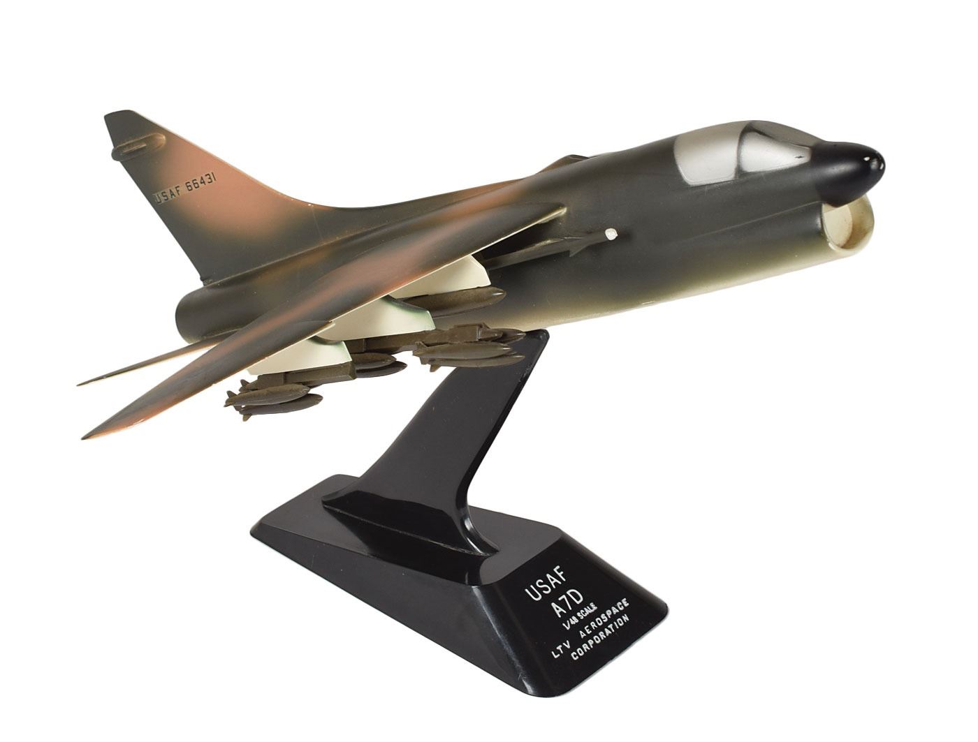 Two vintage models: a model of a McDonnell Douglas KC-10 Extender aerial refueling tanker aircraft made by Pacific Miniatures, approximately measuring 7? tall, 13.5? nose to tail, and 11.5? wing to wing, set on a wooden base with an affixed plate; and a 1:48 scale model of a United States Air Force LTV A-7D Corsair II carrier-capable subsonic light attack aircraft, approximately measuring 8? tall, 11.5? nose to tail, and 9.5? wing to wing, set on a plastic base with engraved text. In overall fine condition, with slight scuffing and marks. From the personal collection of Charlie Dry, a former Apollo test astronaut and research engineer and senior scientific analyst at NASA.