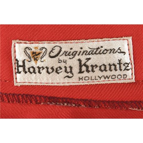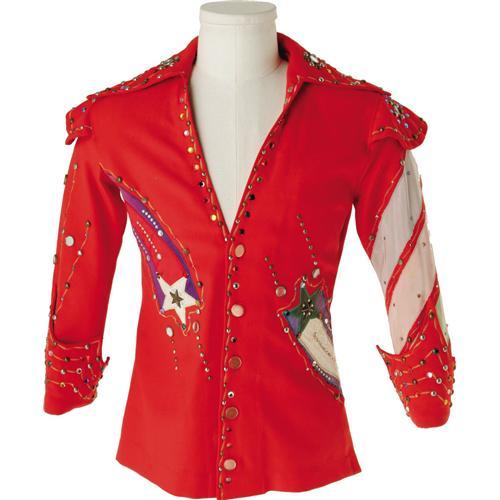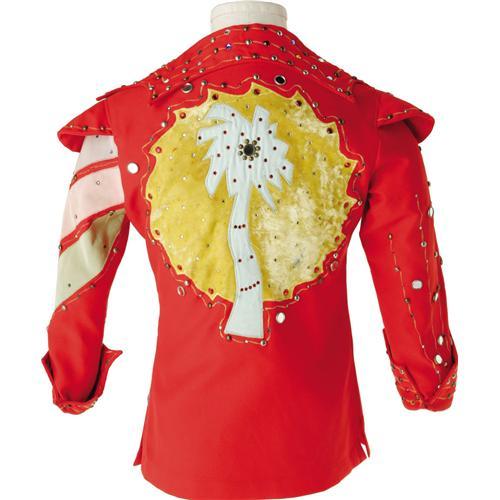 <B>KC and the Sunshine Band Stage Worn Jacket.</B></I> A medium-sized red cotton jacket designed by Harvey Krantz and worn by a member of the band in the '70s, adorned with rhinestones, studs, a large palm tree design on the back, and other decorations. In Very Fine to Excellent condition with some rust-colored spots on the back.<I>From the Robert Johnson Memorabilia Collection.</B></I><BR><BR><b>Shipping:</b> Clothing, Costumes & Jerseys (<a target="_blank" href="http://www.heritageauctions.com/common/shipping.php">view shipping information</a>)