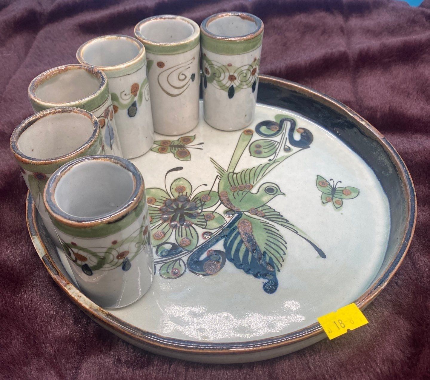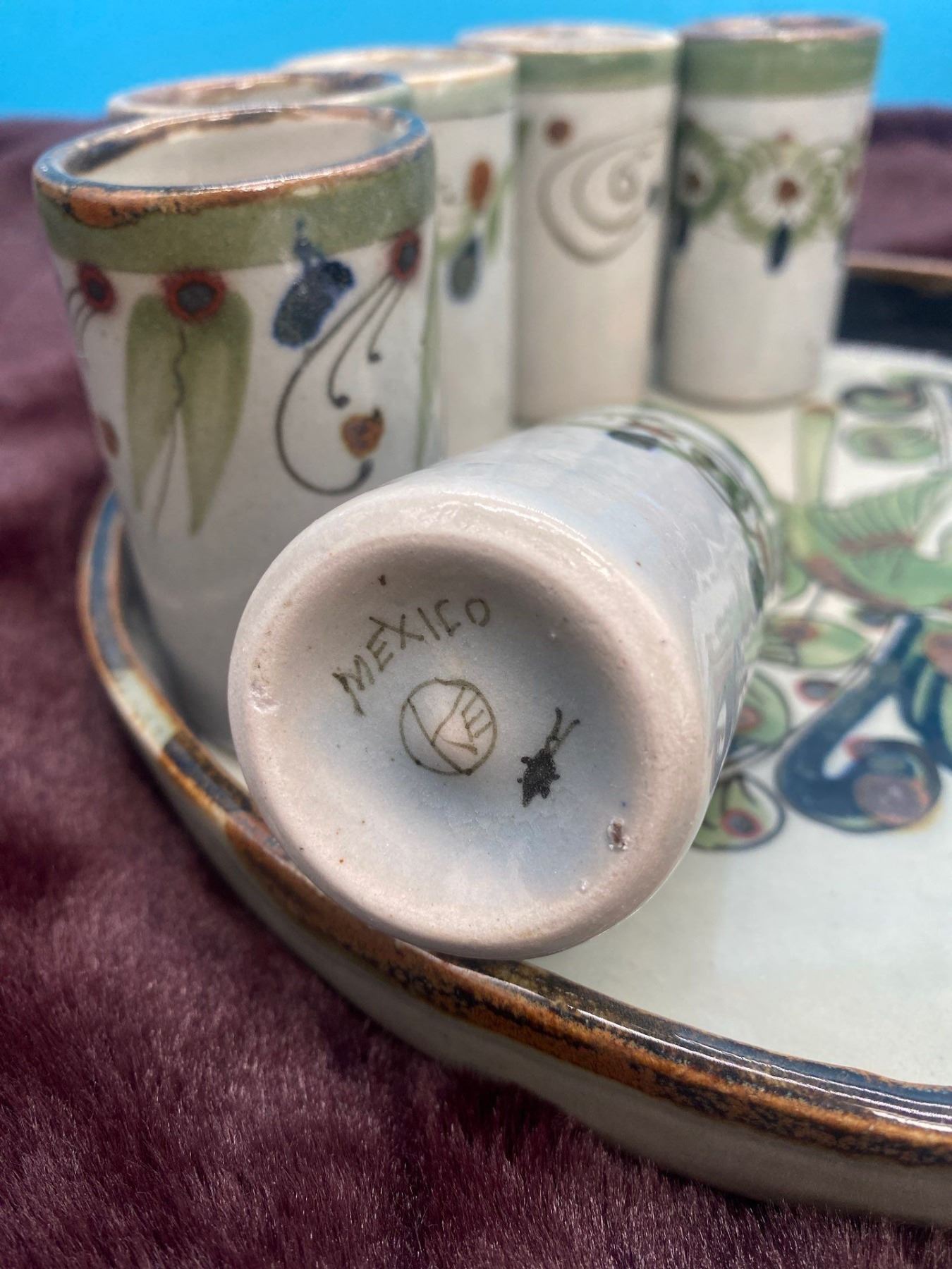 KE Ceramic Serving Tray w/ 6 Shot Glasses Made in Mexico 10x10