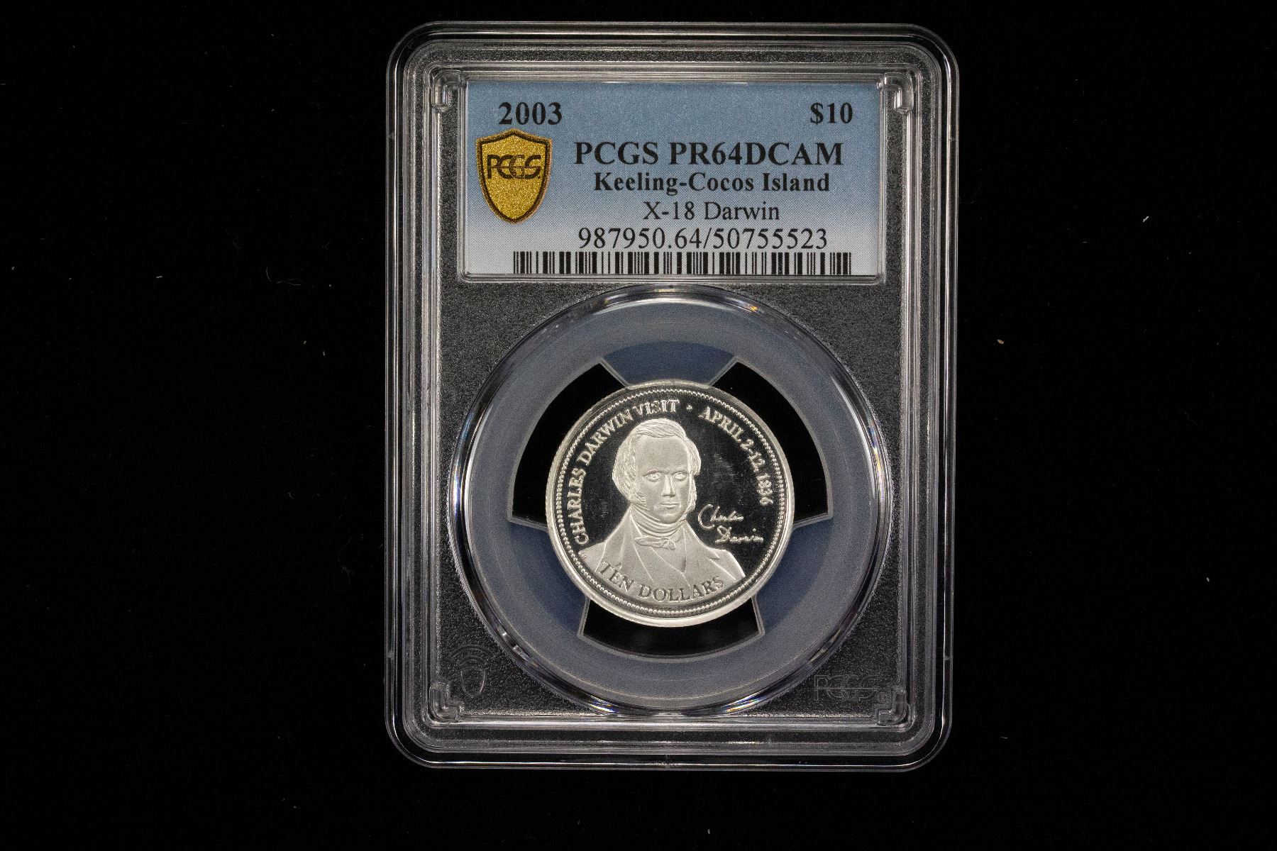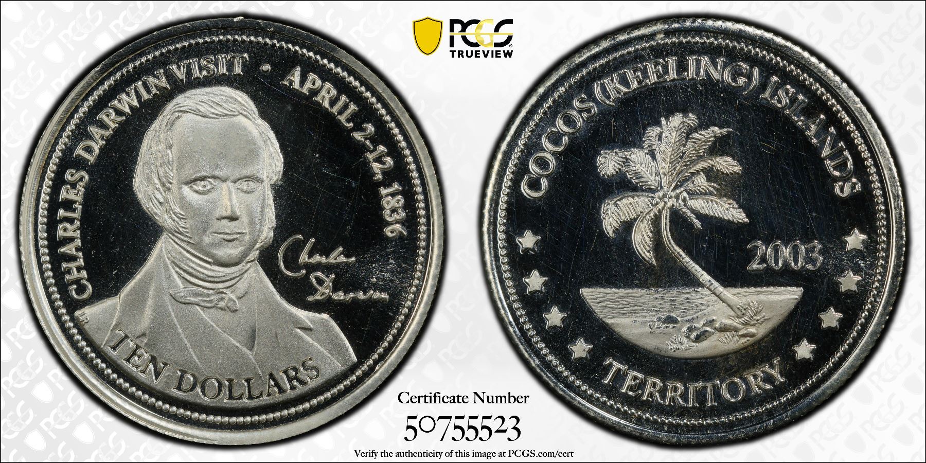 KEELING-COCOS ISLANDS: Republic, AR 10 dollars, 2003, KM-X18, Commemorating Charles Darwin’s visit to the island in 1836, struck at the Patrick Mint, Santa Rosa, USA, a wonderful reflective proof example! PCGS graded Proof 64 DCAM.
