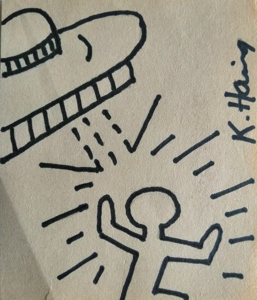 A drawing by Keith Haring in black sharpie of a man being chased by a UFO, additionally signed. Size: 5x4 inches. Mounted and framed. Supplied with coa. Condition: Good, with a crease across part of the image.