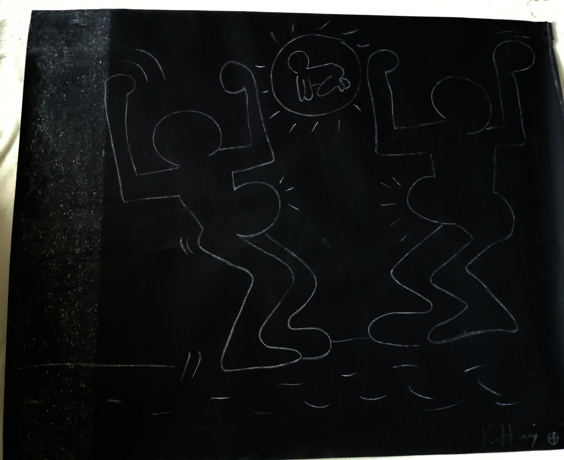 This drawing looks like it probably was from one of New York's subway's. It features two pregnant women and a radiant baby, and is signed by Keith Haring. It measures 37x30 inches and is in fairly good condition, with some creasing. It's mounted and famed and supplied with coa.