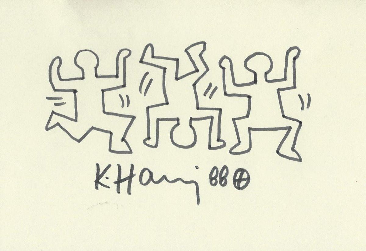 A drawing of break dancing men by Keith Haring. Medium: Felt tip pen on paper. Supplied with coa. The drawing measures 6.5 x 4.5 inches.