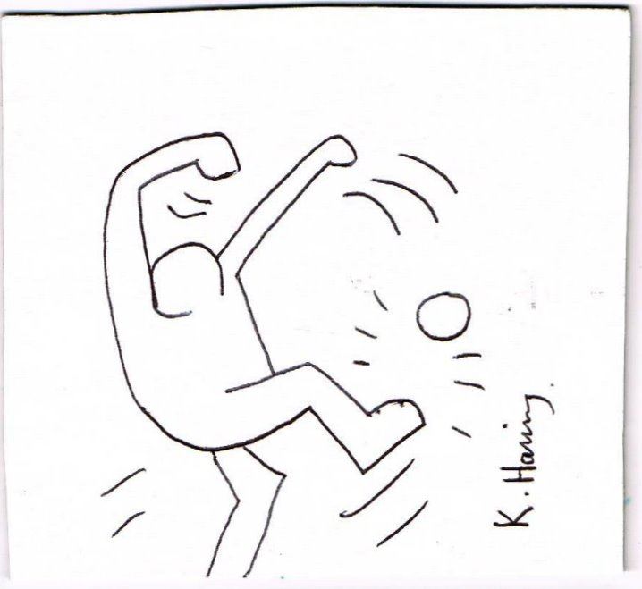 A drawing of a man playing soccer by Keith Haring. Additionally signed by Haring. The card has been trimmed. Supplied with coa. The card measures 4.5 x 4 inches.