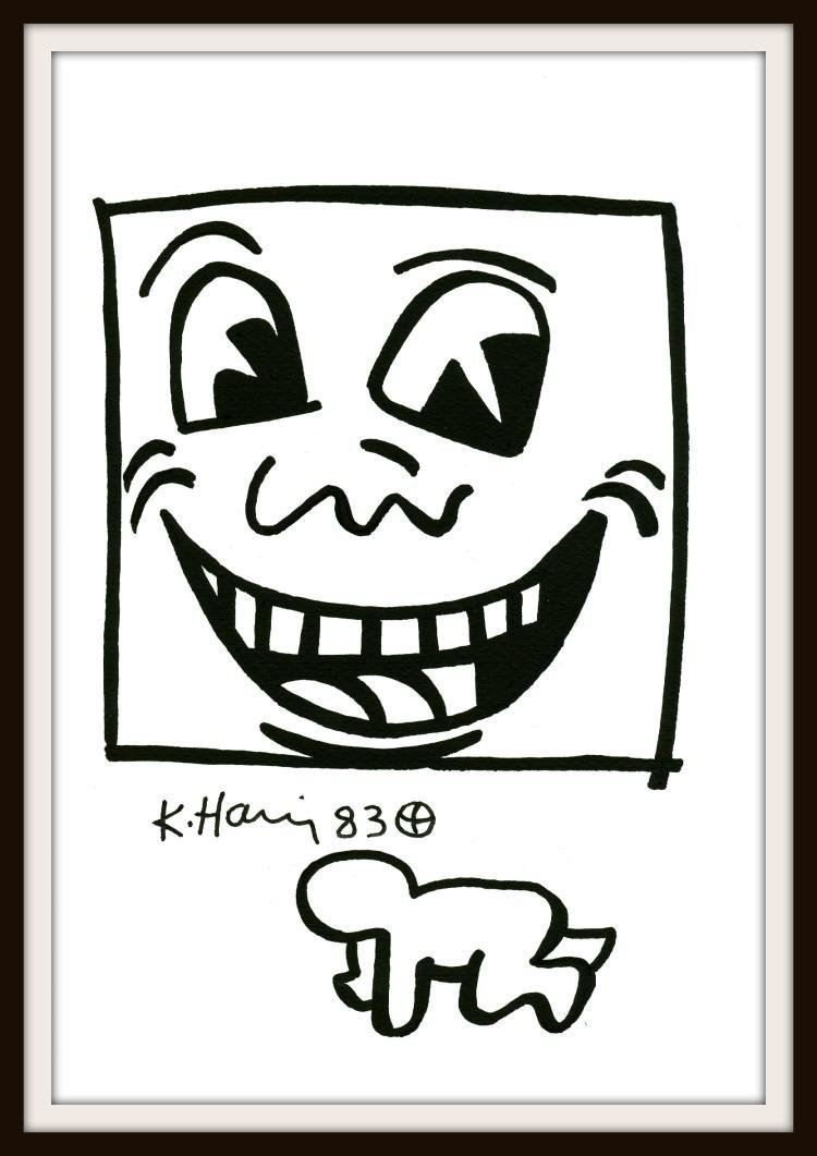 KEITH HARING: TV FACE AND BABY. Sharpie on card. A Graffiti and Pop Art who was Inspired by graffiti in New York City subways, artist Keith Haring created iconic cartoon-like figures in his works and befriended Andy Warhol. Sadly he passed away of Aids which frequently featured in his works. The drawing is professionally mounted and framed in wood.